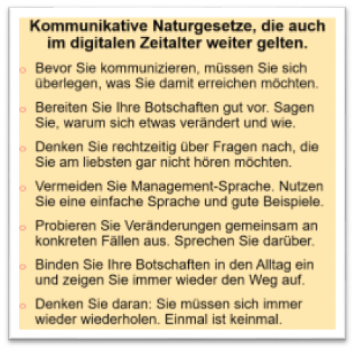 Organisationen, in denen Kommunikation früher nicht als Führungsauftrag erkannt wurde und die nicht wirkungsvoll kommunizierten, werden durch die Digitalisierung nicht viel verbessern. Für diese Organisationen gilt leider: „A fool with a (new) tool ist still a fool.“
